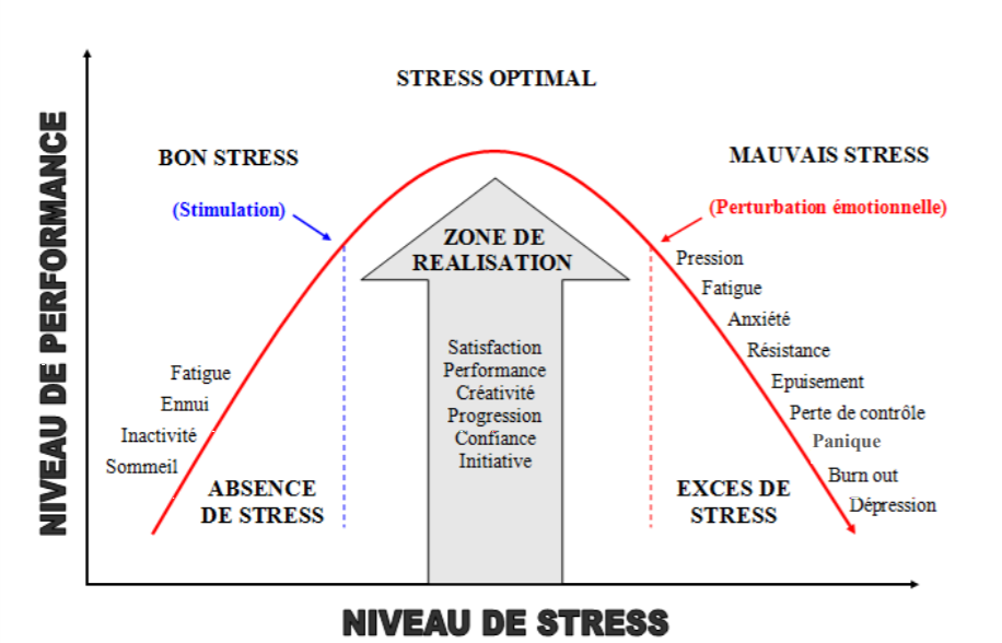 Votre niveau de stress va influer directement sur votre performance comme vous le montre ce graphique (Courbe de performance en situation de stress, d’après Yerkes et Dodson extraite de cet article)