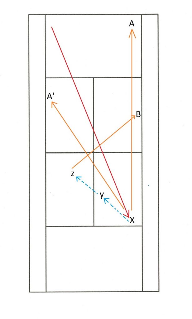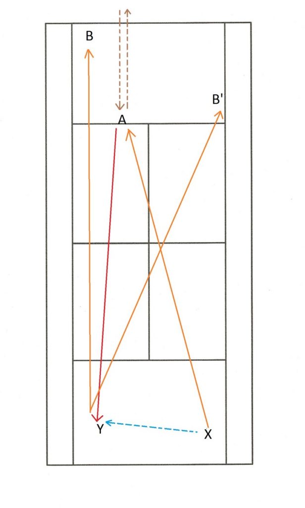 Lors d’un échange dans la diagonale (ici coup droit), le défenseur livre une balle courte en X. La possibilité n°1 est l’attaque long de ligne (cible A), suivie au filet d’une volée courte-croisée. La deuxième possibilité est la balle courte croisée en A’, suivie d’un coup de débordement en A. Si tu alterne bien ces deux possibilité la balle courte croisée entraînera une réplique très faible de ton adversaire (voir gagnante directement…).