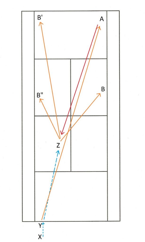 Echanges dans la diagonale des revers, j’obtiens une balle courte suite à une balle haute et liftée sur le revers adverse, je joue (de la position X) une balle coupée basse dans le carré de service sur la cible A. Je suis mon coup au filet (reprise d’appuis en position Y), mon adversaire n’a pas d’angle pour tirer son passing. Il est de plus contraint de courir vers l’avant pour relever une balle basse (difficile à jouer long de ligne) et donc jouera probablement croisé. La volée (en Z) a toute les chances d’être simple (ici cible B).