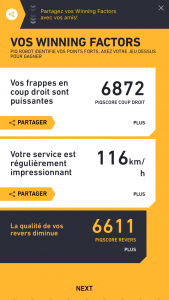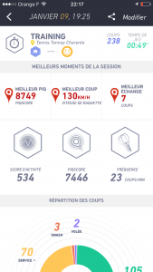 On commence à rentrer dans le détail de la session. On a à présent le temps de jeu : 49 minutes, le nombre de coup joué : 238 et les meilleurs moments. Le meilleur PIQ Score 8749 (mais je ne sais pas de quel type de coup il s’agit), le coup le plus rapide 130 km/h (chez moi c’est presque toujours un service) et le meilleur échange 7 coups (un petit rallye).
