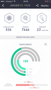On a ensuite un score d’activité qui dépend du nombre/vitesse des coups joués, un PiQscore moyen et une fréquence de coups (23 par minutes ici). En ce qui concerne le détail de la répartition des coup, on obtient : 105 coups droits, 70 services, 58 revers, 3 smashs et 2 volées. Le joueur qui a un bon coup droit peut mesurer la proportion de coups droits jouées par rapport à celle des revers. Le joueur offensif peut mesurer s’il est monté réellement suffisamment au filet (nombre de volées jouées).